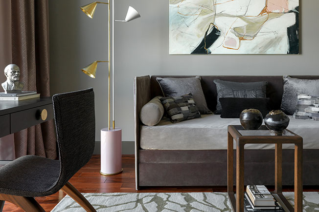 Кабинет. Диван Anrie Moretti, подушки enere.it. Столик YachtLine, Письменный стол, торшер и картина Any Home. Винтажный стул Repeat story. ковер The Rug Company.