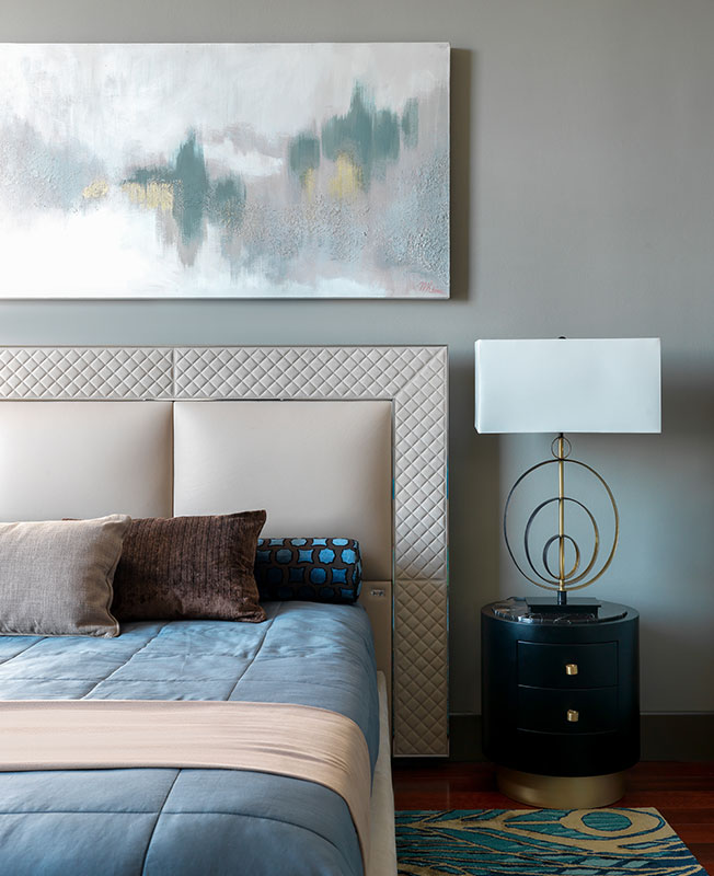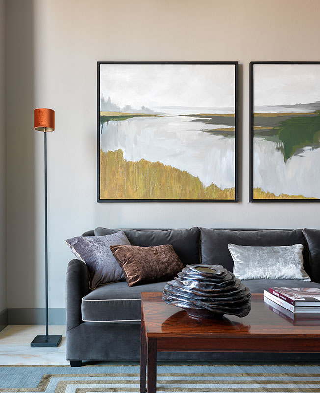 Чтобы еще больше акцентировать внимание на природных материалах и общей идее интерьера, специально для проекта Наталия написала все картины. «Тонкие золотистые линии отсылают к заданному стилю и находят продолжение в элементах интерьера: в графике ковра, в форме ручек тумбы, в отблесках латуни, в бликах закатного солнца на люстре» — рассказывает автор.