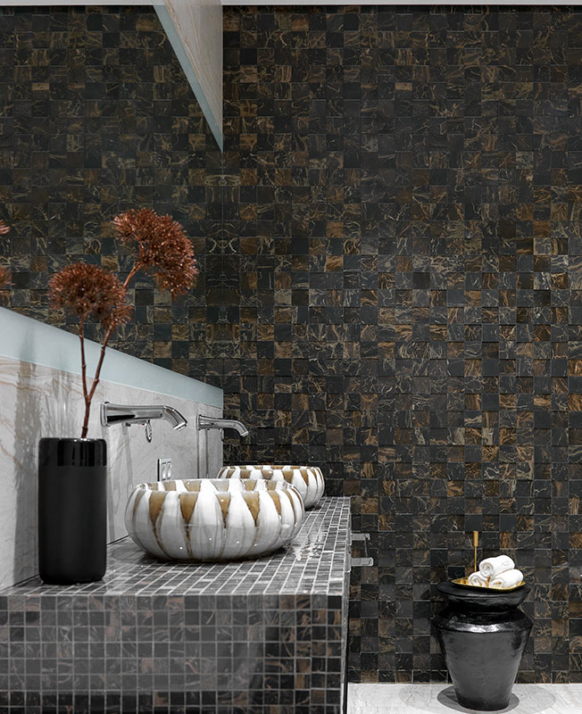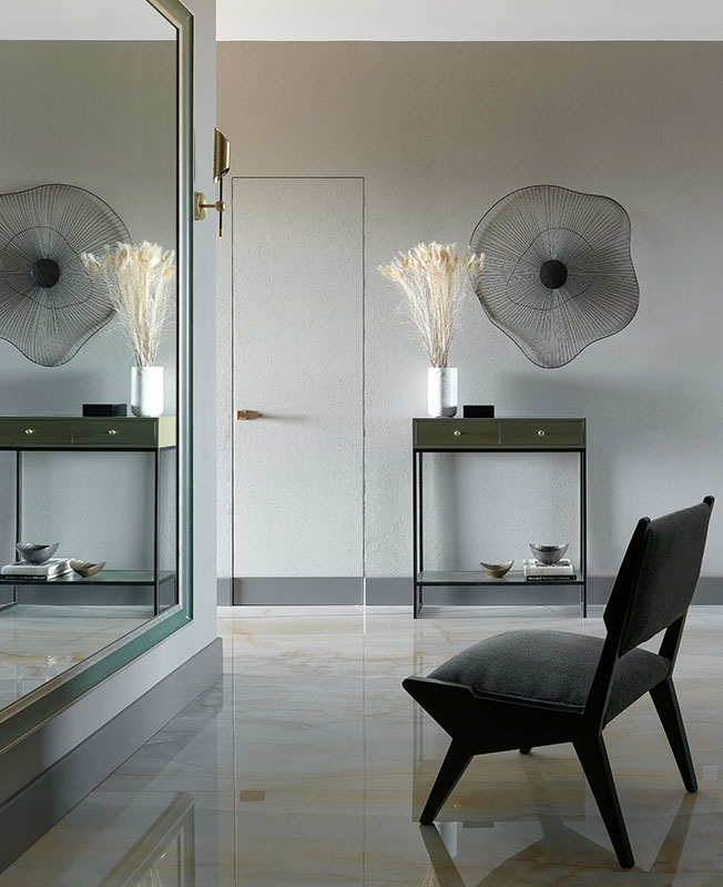 Наталия выдержала баланс глянцевых и матовых фактур. Стены были выкрашены в мягкий тепло-серый оттенок, старый плинтус заменен на более высокий, пропорциональный пространству, покрытый матовой эмалью на тон темнее стен. Все вместе уравновесило сияние оникса, подчеркнуло его красоту и богатство природной гаммы.