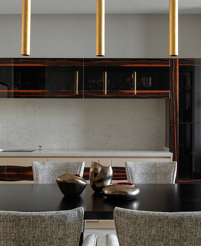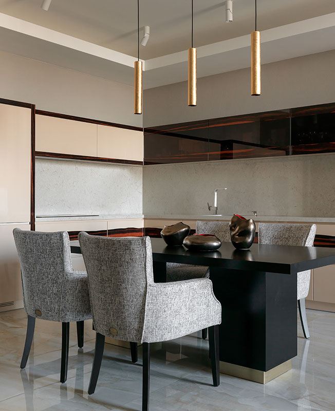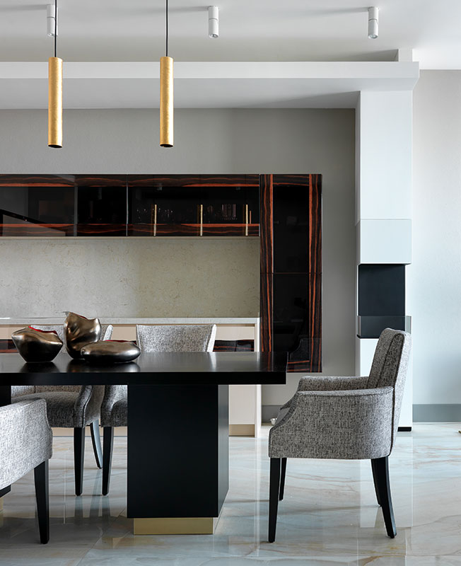 Просторный обеденный стол Any Home отделан шпоном под черной матовой эмалью и окружен удобными стульями Dantone Home. Акцентом служат подвесные светильники Ideal Lux, покрытые листами золотой потали. Вазы John Richard.