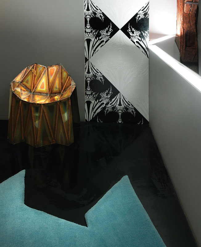 На черном бетонном полу собрала композицию из эффектных авторских предметов, выбирала любимые цвета, отделки и фактуры. Общая площадь — 200 кв. метров. На первом этаже расположены кухня-гостиная, на втором — спальня и просторная ванная комната. Вся мебель — работы дизайнеров, представленных в галерее: Матиаса Кисса, Ифенаи Оганву, Пьера Гоналона и Джулиана Мэйора.