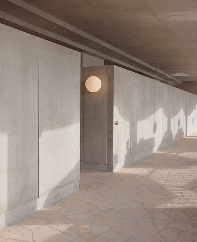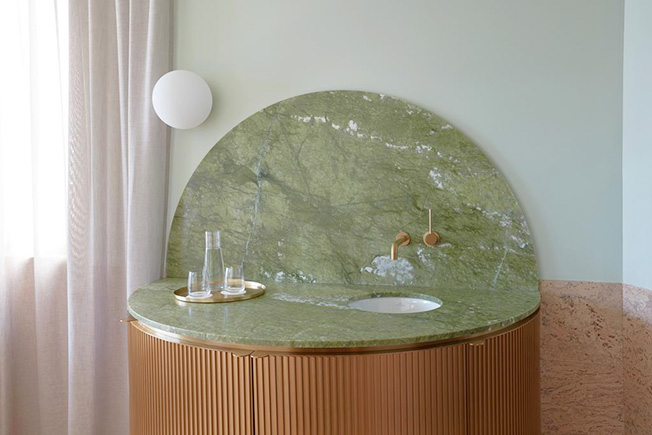 В номерах преобладают пастельные тона — приглушенные розовый, голубой и зеленый, отсылающие к стилистике ретро. Эффект усиливают многочисленные арки и полукружия: от оконных проемов до формы столиков в ресторане, от линий светильников до очертаний балконов. В отделке использовали натуральную древесину и мрамор, пробковое покрытие и сизаль.