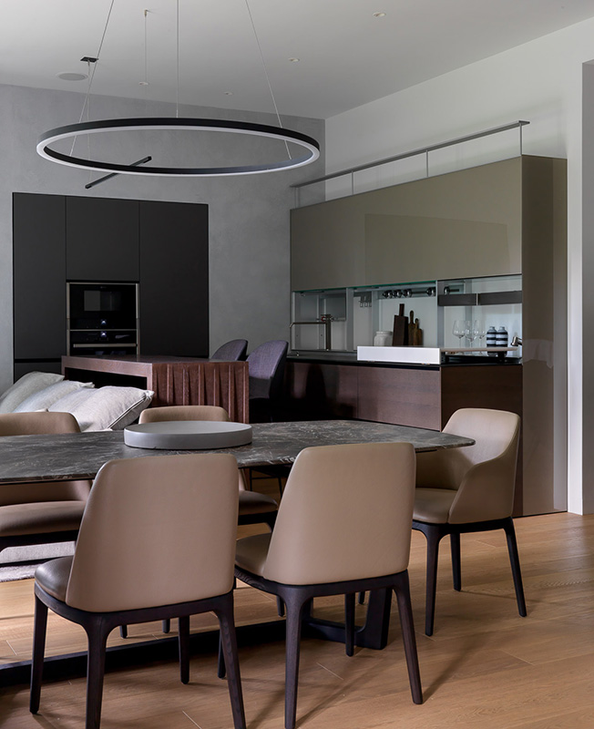 Обеденный стол и стулья Poliform. Диван BoConcept. Люстра Centrsvet.