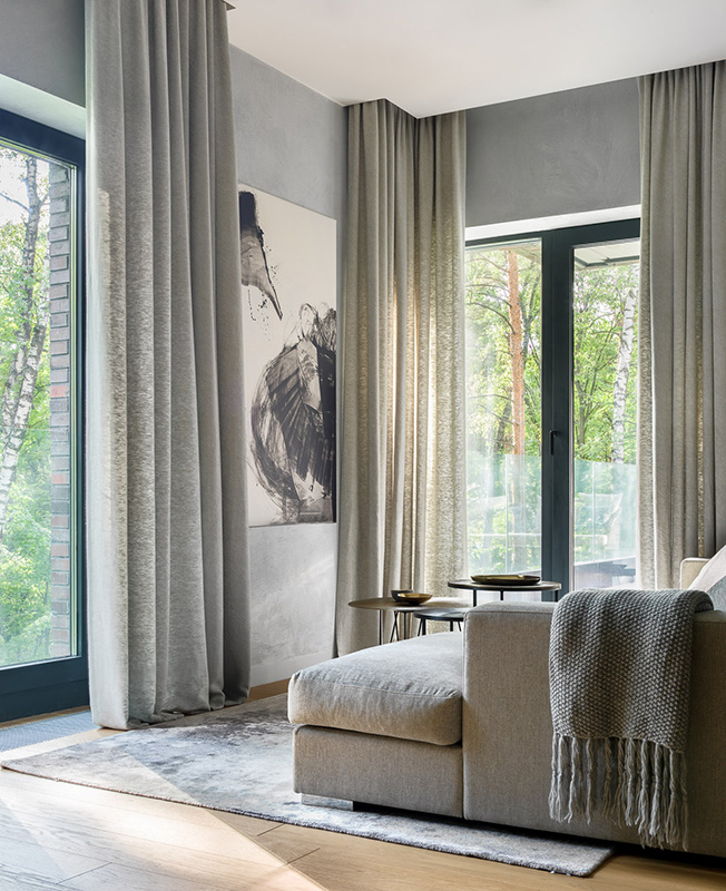 Дом, в котором находится квартира, расположен немного отдаленно от остальных домов. Квартира на первом этаже, двумя сторонами развернута в сторону леса и реки, поэтому вид из любой точки внутри помещения завораживает. Особенно это чувствуется, когда выходишь на террасу. Это главная точка всей квартиры — просторная, со стеклянным ограждением, немного поднятая над уровнем земли, с открывающимся видом на лес и реку. Она притягивает устроиться с бокалом вина на уютном диване под тенью деревьев и погрузиться в волшебную атмосферу этого места».