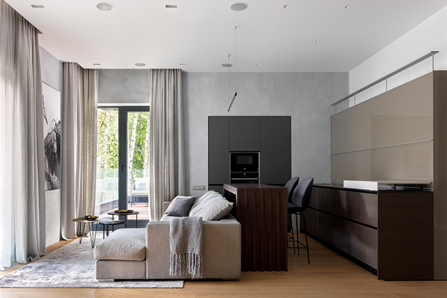 Диван BoConcept. Журнальные столики Dantone Home. Кухня Valcucine. Барная стойка сделана на заказ по чертежам дизайнеров (компания Wood&Interiors). Барные стулья Gubi. Шторы KRASSKY. Ковер Dovlet House. Картина Софьи Пятницкой, галерея Art Brut Moscow.