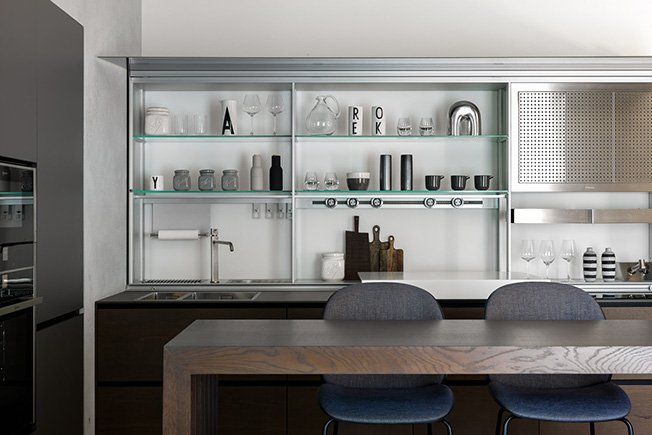 «После трех месяцев просчетов мы создали такую конфигурацию, которая позволила поставить кухню Valcucine, о которой мечтала заказчица. Модель New Logica отличается увеличенной глубиной — почти 100 см вместо стандартных 60 см. Но зато позволяет эргономично и максимально удобно организовать рабочее пространство и скрыть все кухонное оборудование: мойку, кран, электрические розетки, малую бытовую технику и вытяжку.