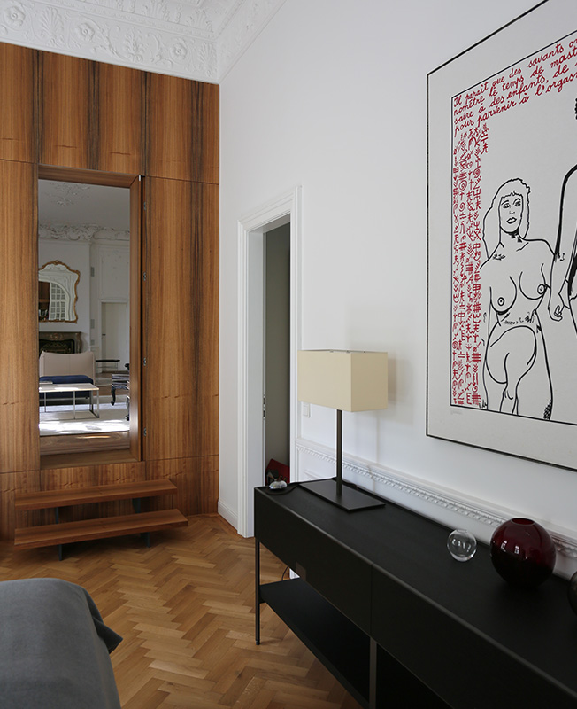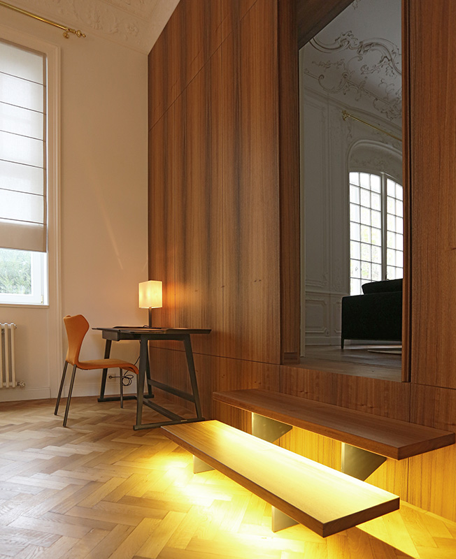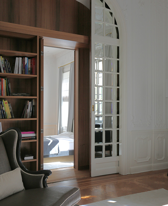 Апартаменты удовлетворяли почти всем требованиям, но из-за анфиладного построения не хватало одной изолированной комнаты — для ребенка. И это при том, что размер основных комнат достигал 75 кв. метров. Решение оказалось парадоксальным. Мы спроектировали дополнительный, потайной вход из семейной гостиной в спальню — спрятали дверь в шкафу с зеркальными раздвижными дверьми. Проходная комната перед спальней стала детской. Кроме того, в портал прекрасно вписались книжные полки, которые были так необходимы семейной гостиной. Это решение устроило всех, увеличив функциональность и добавив шика двум помещенииям.