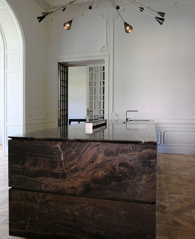 Тему 1960-х развивает гениальный мастер света Серж Муй, а над кухонным островом помещен еще один предмет той эпохи — люстра Sputnik от Stilnovo. Графичные светильники Муя контрастируют с мягкими изгибами люстры, изготовленной в Венеции специально для парадной столовой.