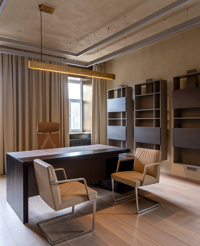 «Офис представляет собой трехэтажное здание, на первом этаже располагаются конференц-залы, а на втором и третьем — кабинеты и библиотеки двух руководителей. Общая площадь 800 кв. метров, кабинетов — 277 кв. метров. Проект нам достался на стадии строительных работ — в здании проходила реконструкция.