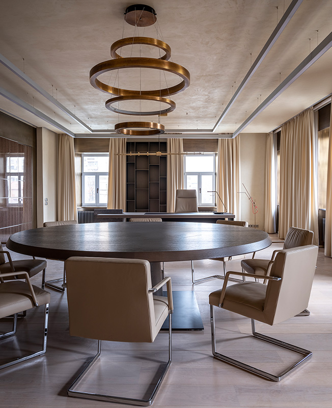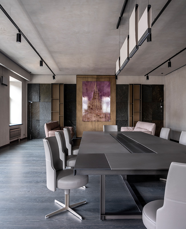 Для декорирования стен в кабинете второго этажа были заказаны крупноформатные слэбы из сланца толщиной от 3 до 10 см. На третьем этаже отдали предпочтение текстильным панелям. Объединяющим материалом в обоих кабинетных блоках выступают латунь и двери фабрики Longhi.