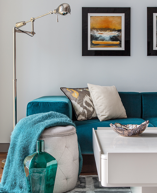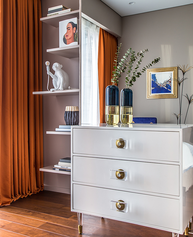 Войдя впервые в пространство будущей спальни, я сразу обратила внимание на то, как солнце отражается в башне Меркурий золотисто-оранжевыми переливами. Тут и началась моя история цвета, мне захотелось внести эти краски в наш интерьер. Заказчица меня сразу же поддержала. Так в спальне получился образ теплого песчаного пляжа на закате с бежево-золотистыми оттенками и ярким, но органичным оранжевым акцентом на шторах. А в гостиной — прохлада морского бриза.