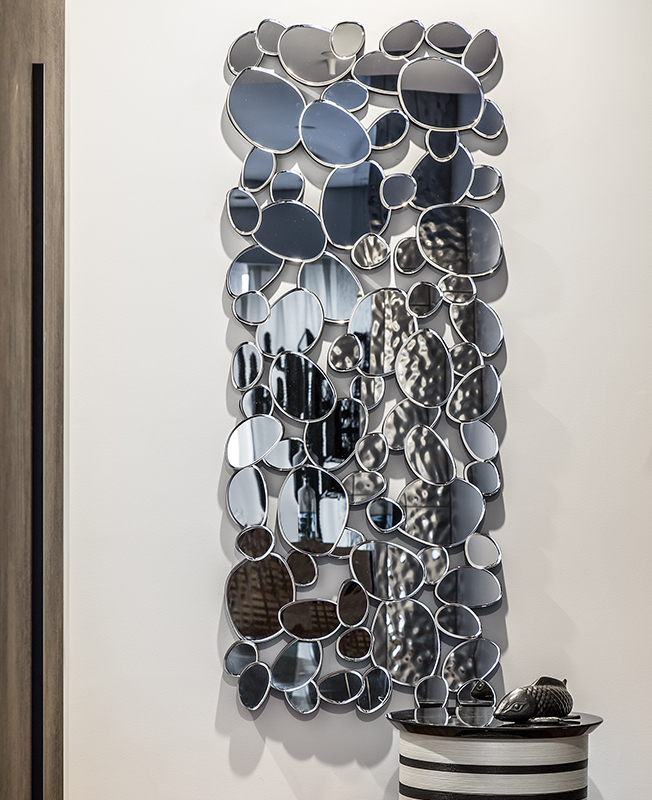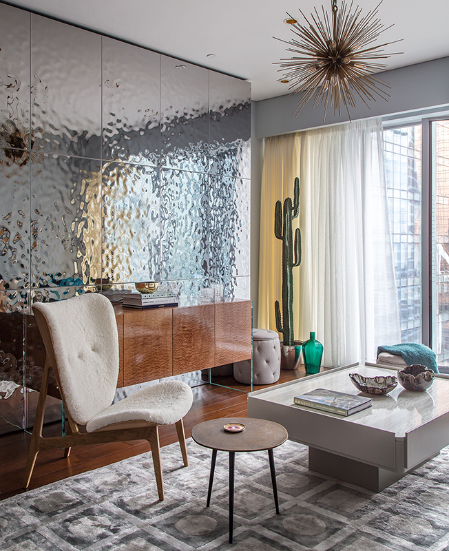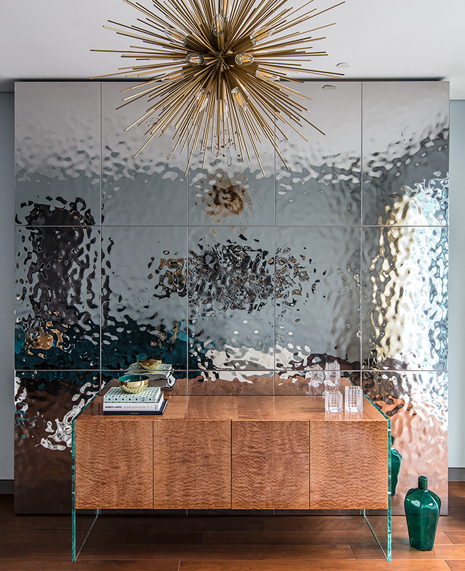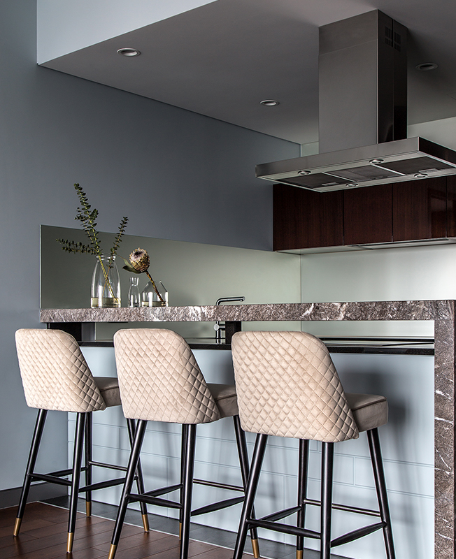 Панель с геометричным членением под барной стойкой изготовлена по моим эскизам и выкрашена в цвет стен гостиной. Самым характерным акцентом, на мой взгляд, получилась колонна, обшитая пластинами из фактурной нержавеющей стали в гостиной. Как оказалось, решить задачу было непросто, поскольку мы старались по максимуму избежать черновых работ. Необходимо было вначале выбрать отделку, а затем под нее проектировать каркас для наращивания колонны — она была несимметрична. Панорамное окно гостиной впускает много света, что позволяет отражать и переливаться металлу в разное время суток, даже ночью, благодаря огонькам небоскребов Москва-Сити.