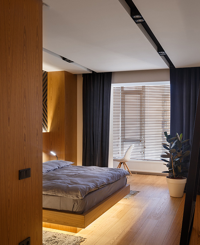 Архитекторы достигли в интерьере эффекта парения: стены, сочетающие ламинам и шпон, подсвечены теплым светом. То же происходит и в спальне: кровать, кажется, парит над землей. Отсюда пришло название проекта «Левитация» — этим словам называют способность преодолевать силу земного притяжения.