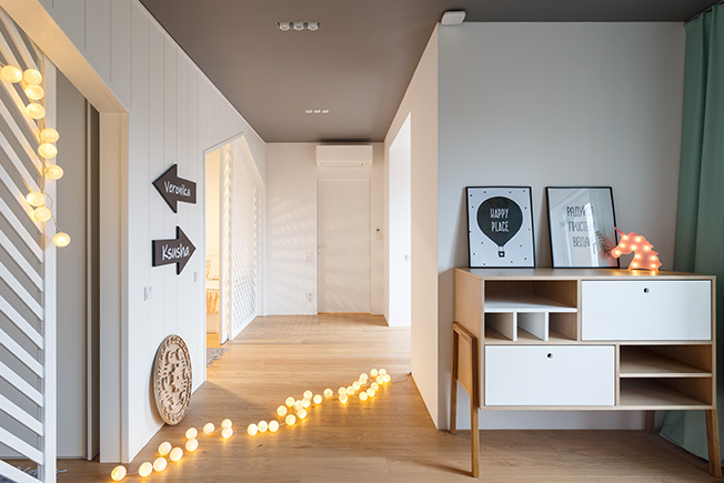 Чтобы увеличить детскую, площадь позаимствовали у гостиной. Просторная комната для двух детей органично зонирована: есть игровая и учебная зоны, где девочки проводят время вместе, а также индивидуальные компактные спальни — они решены как мини-домики и разделены простенком с гардеробом. В системе хранения имеется «потайной тоннель»: по нему девочки ходят друг к другу в гости.