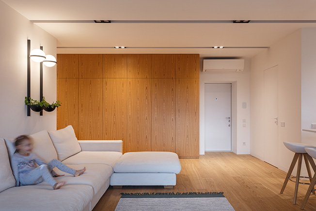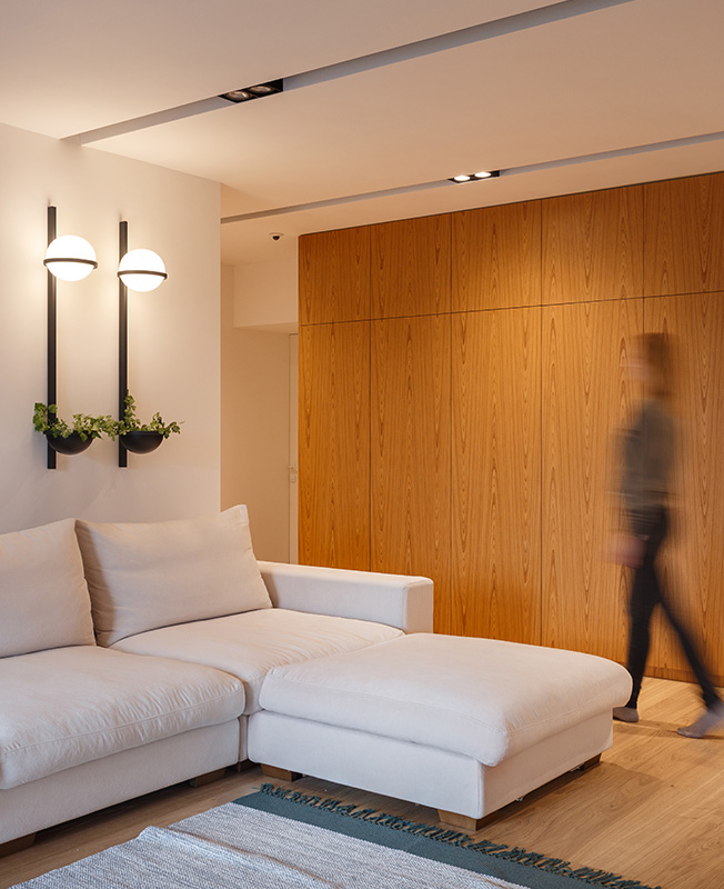 Вместительная гардеробная не считывается как объем: отделка шпоном и гладкие фасады без ручек позволяют воспринимать ее как часть стены. Светильники Vibia, модель Palma. Слева видна дверь в детскую половину.