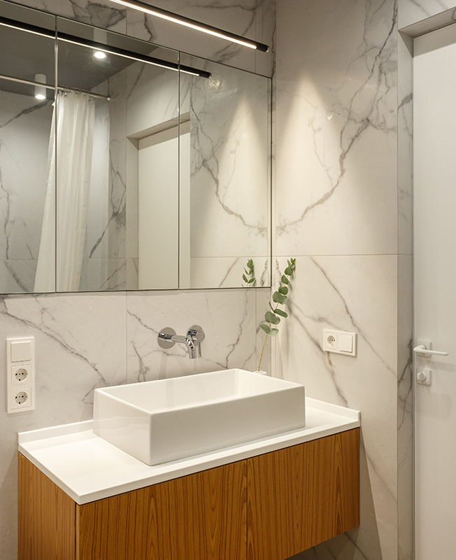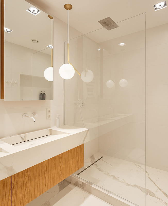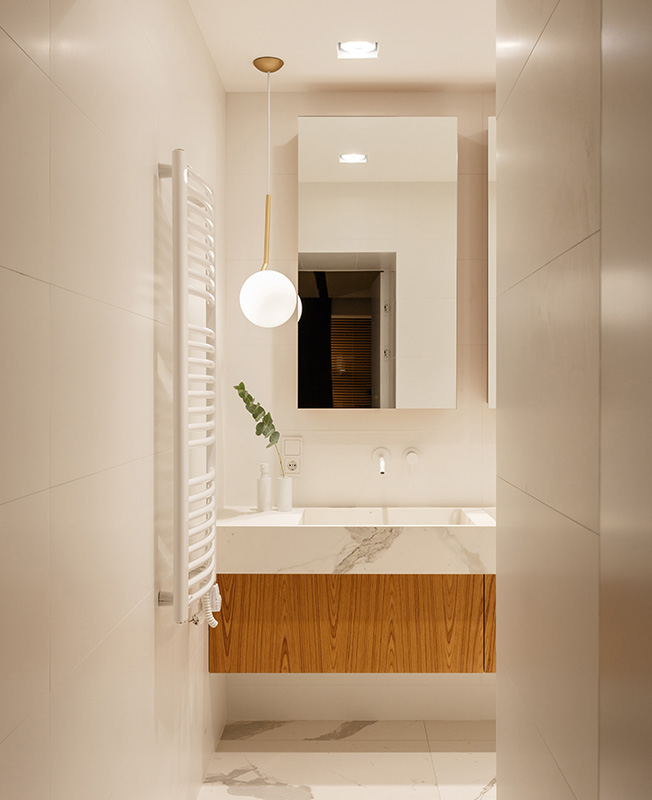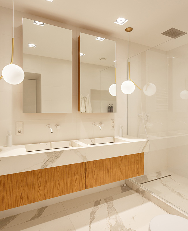 Ванную архитекторы украсили светильниками Flos дизайна Майкла Анастассиадеса. Сантехника Catalano, Villeroy & Boch. Мебель изготовлена на заказ. Как и во всей квартире, здесь использованы ламинам с фактурой камня и дерево теплого оттенка.