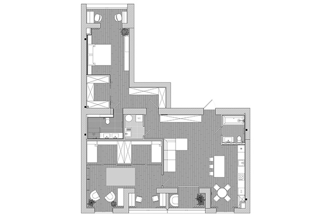 Архитекторы произвели перепланировку. Главный вектор — отказ от коридоров и проходных зон. В результате возникло единое пространство, включающее кухню, столовую, гостиную, прихожую с объемной системой хранения. Присоединенный балкон стал приятным лаунджем. Особая удача архитекторов — отдельная постирочная со всем необходимым оборудованием.