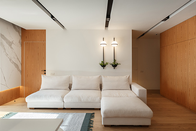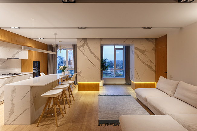 Палитру интерьера определили материалы. Архитекторы применили беспроигрышную комбинацию: светлый камень + тёплое дерево + белый + графит. Это прекрасная база, на фоне которой органично смотрятся зелень комнатных растений и текстиль нюдовых оттенков. Материалов минимум — это придает интерьеру цельность.