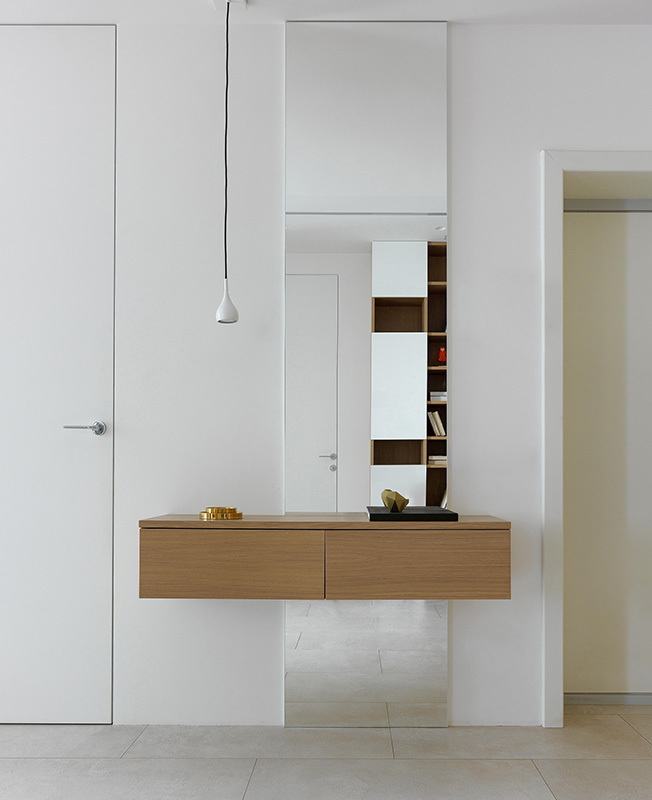 Архитектор мастерски организовал системы хранения. Наряду со скрытыми, не заметными глазу, есть и открытые, как, например, стеллаж в прихожей: это не только функциональный, но и декоративный элемент. На полу плитка Panaria Ceramica, на стенах краска Benjamin Moore. Над тумбой светильник Fabbian.