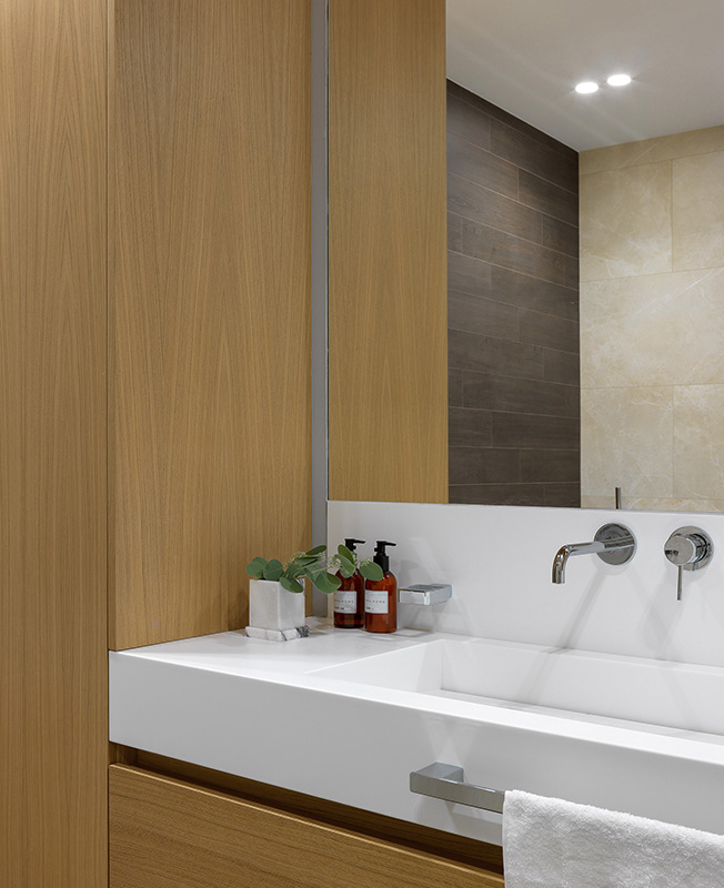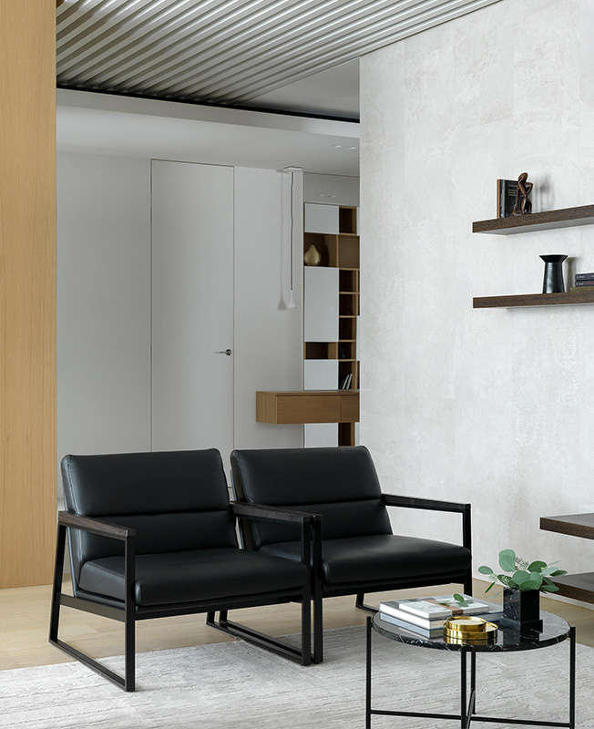 В отделке использованы шпон, керамогранит Panaria Ceramica и Arch-Skin. Система хранения вписана в деревянный портал перед входом в кабинет — в него ведет почти незаметная дверь скрытого монтажа. Диван Desiree. Столик с мраморной столешницей Creat.m.studio.