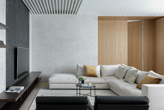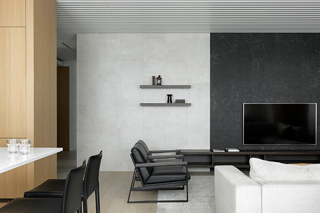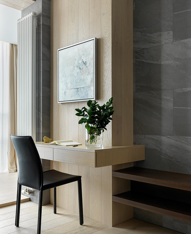 В отделке сочетаются шпон, керамогранит Panaria Ceramica и Arch-Skin. Кресла Ditre Italia.