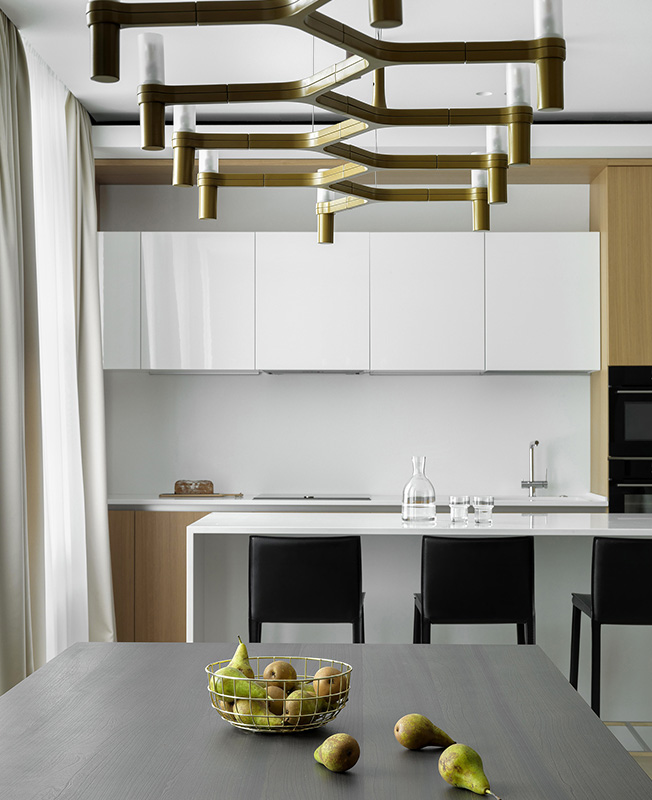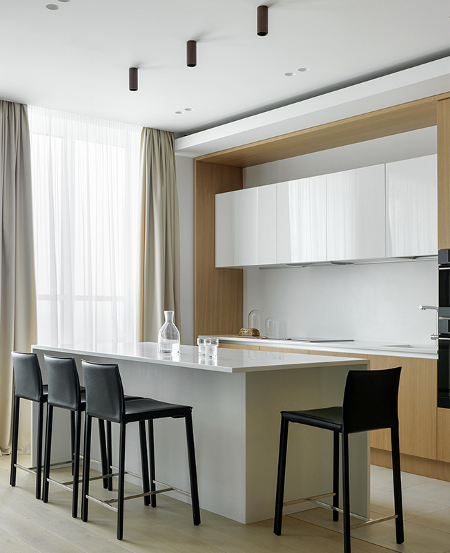 Архитектор выполнил пожелания заказчиков: сделал интерьер светлый, но с контрастами как в цвете, так и в материалах. В отделке использованы шпон, керамогранит Panaria Ceramica и Arch-Skin. На полу паркетная доска Haro. Кухня объединена с гостиной. Диван Desiree, кресла Ditre Italia. Кухня Aster Cucine. Бытовая техника Gorenje. Барные стулья BoConcept. Столик Creat.m.studio. Над островом светильники Studio Italia Design.