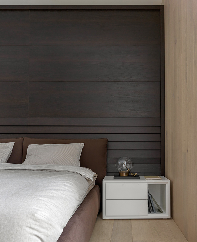 Спальня. Кровать Tonin Casa. На стенах та же паркетная доска, что и на полу. Изголовье выделено панелями в темном шпоне с горизонтальными рейками. Настольная лампа Galotti & Radice.