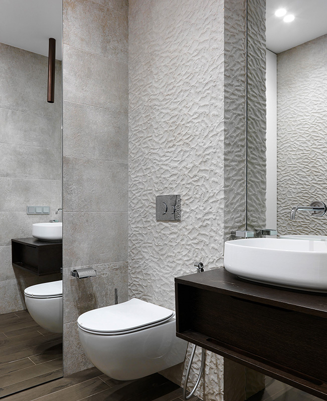 Гостевой санузел. Унитаз Flaminia. Раковина Artceram. Смеситель Fima. Cветильник над раковиной Studio Italia Design. Керамогарнит под камень Venis. Керамогранит под дерево Casalgrande Padana. Корпусная мебель изготовлена на заказ.