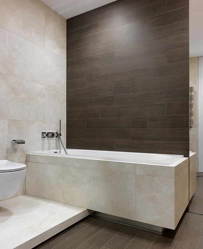 Хозяйская ванная. Ванна Villeroy & Boch. Унитаз Flaminia. Смесители Fima. Душевая кабина Duka. Корпусная мебель изготовлена на заказ. Керамогранит под дерево Casalgrande Padana. Керамогарнит под камень Fap.