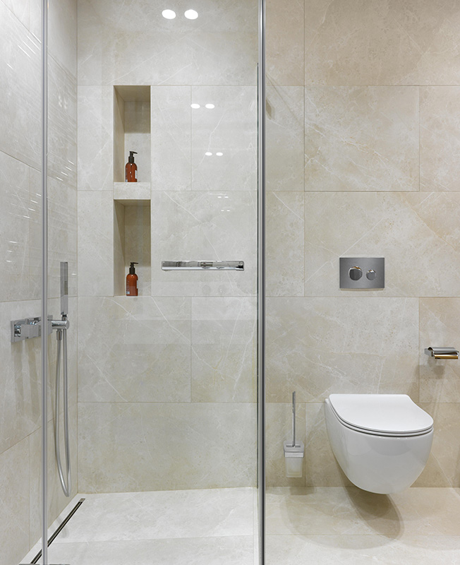 Хозяйская ванная. Унитаз Flaminia. Душевая кабина Duka. Смесители Fima. Керамогранит под дерево Casalgrande Padana. Керамогарнит под камень Fap.
