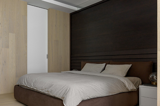 Стены спальни отделали паркетной доской — той же, что лежит на полу. Изголовье кровати выполнили из панелей в темном шпоне дуба с установленными внахлест рейками.