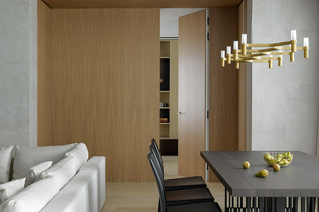 Система хранения вписана в деревянный портал перед входом в кабинет — в него ведет почти незаметная дверь скрытого монтажа. Стол Molteni&C, стулья BoConcept. Над столом люстра Nemo.