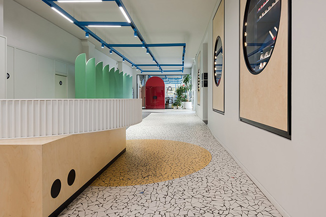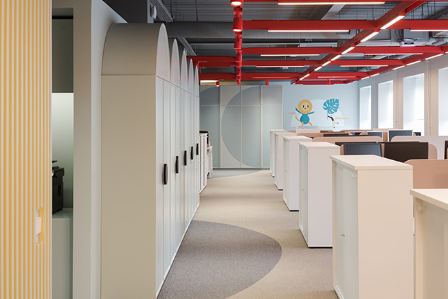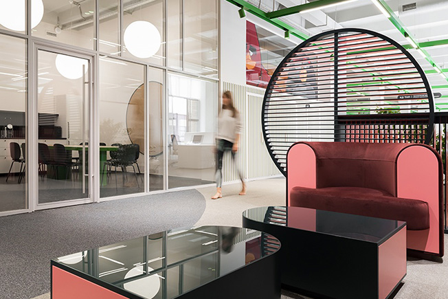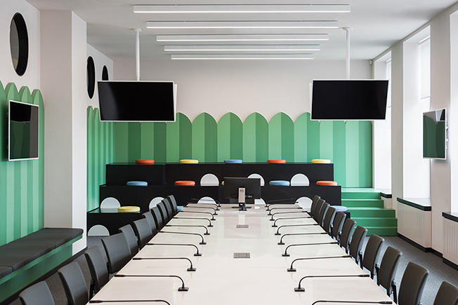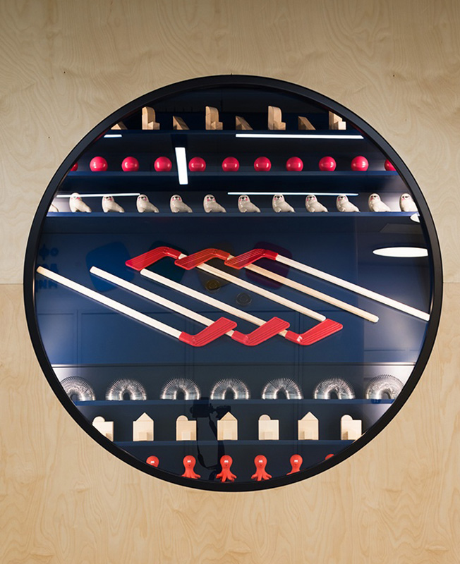 Идея игрового поля отразилась и в переговорных: популярные игры — нарды, крестики-нолики и пинбол — превратились в рисунки и паттерны, определившие название и характер каждого пространства. Специально для лаундж-зон разработана серия мебели: предметы одновременно напоминают разрезанные лакомства и увеличенные игрушки.