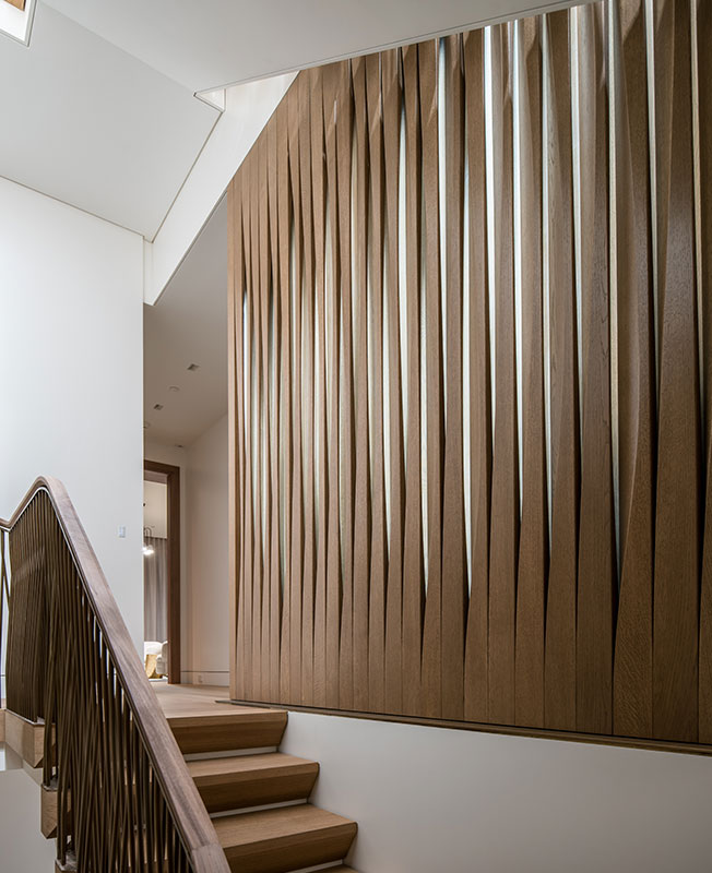 Целый этаж отведен хозяйским апартаментам. Скульптурная перегородка из дубовых планок оформляет пространство.