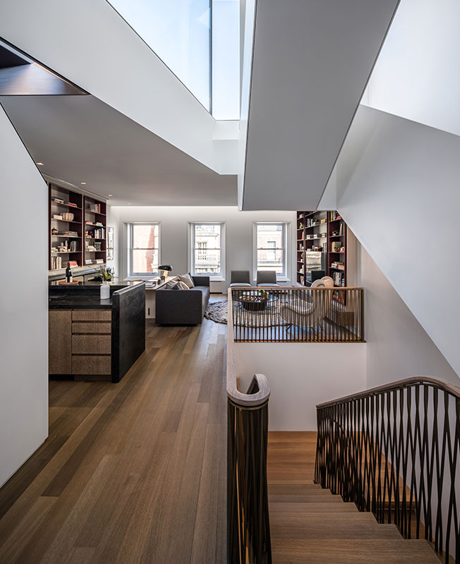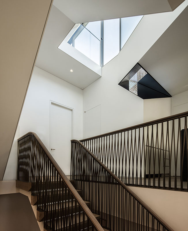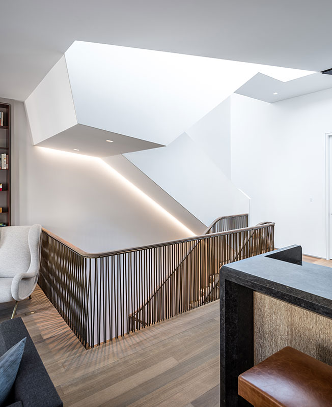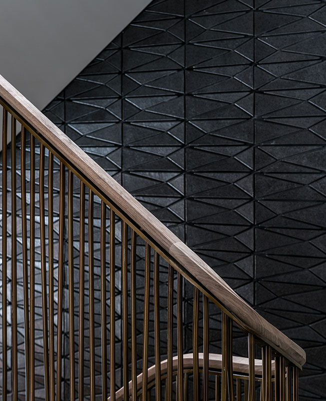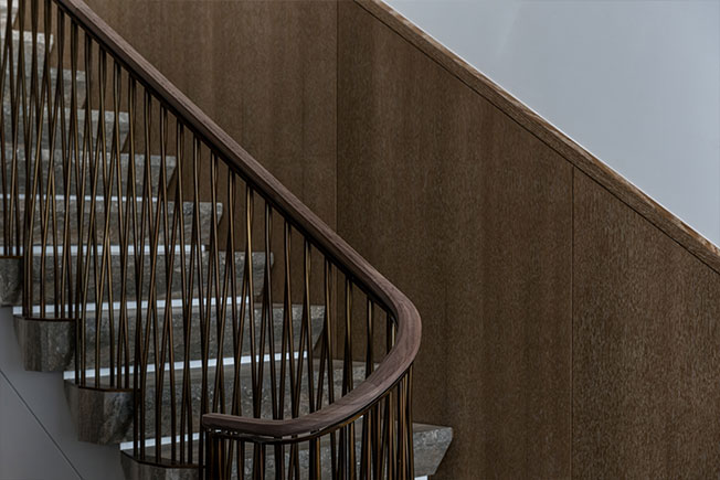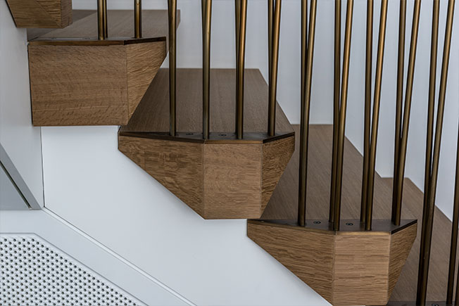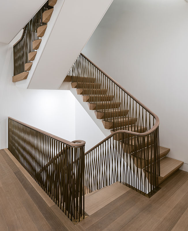 Лестница сочетает тонированный дуб и бронзу. Граненая форма ступеней поддерживает внутреннюю архитектуру здания.