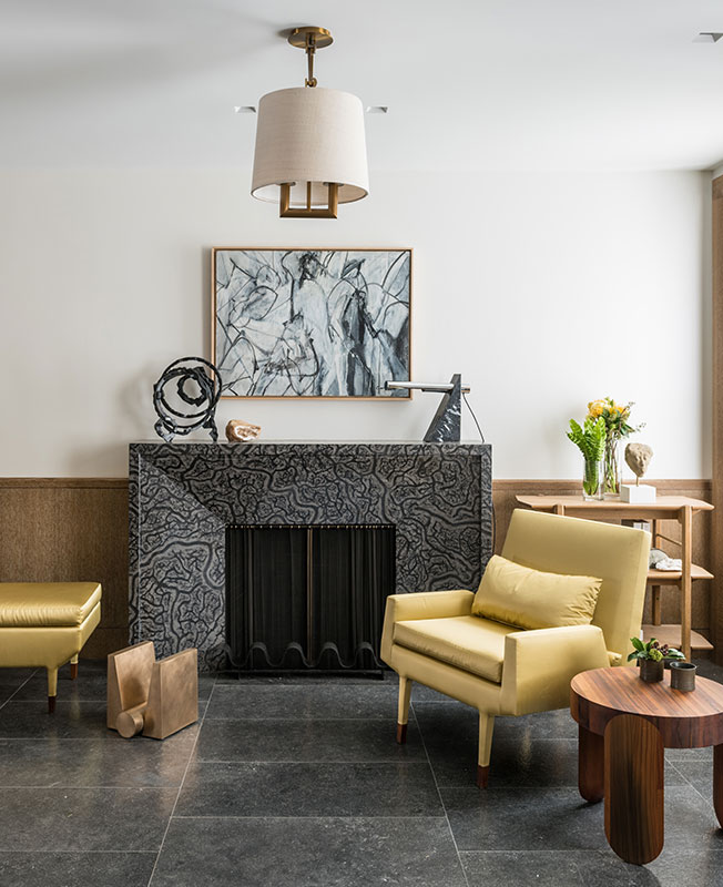 Гостиная на первом этаже сочетает винтажную классику дизайна и предметы, изготовленные мастерами специально для проекта. Винтажные кресла дизайна Освальдо Борсани, столик Джо Понти, торшер Вико Маджистретти. Над камином крупноформатная работа Юзу Оно, Dillon + Lee Gallery. Деревянный стол выполнил Кристофер Куртц, стол из силикона и бронзы — KGBL.