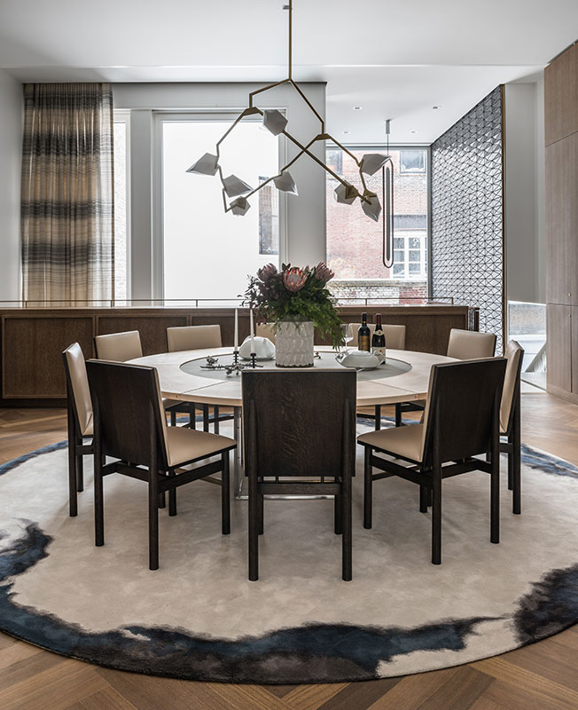 Столовая. Винтажный стол, диз. Поул Кьерхольм, сочетает мрамор сорта чиполлино и древесину клена. Стулья — работа Кристофера Куртца. Люстра выполнена на заказ компанией Beс Brittain, ковер по эскизам MKCA произведен Tai Ping. Плетеные занавеси изготовил специально для проекта Хироко Такеда. Керамическая плитка: Boston Valley Terra Cotta по эскизам MKCA.
