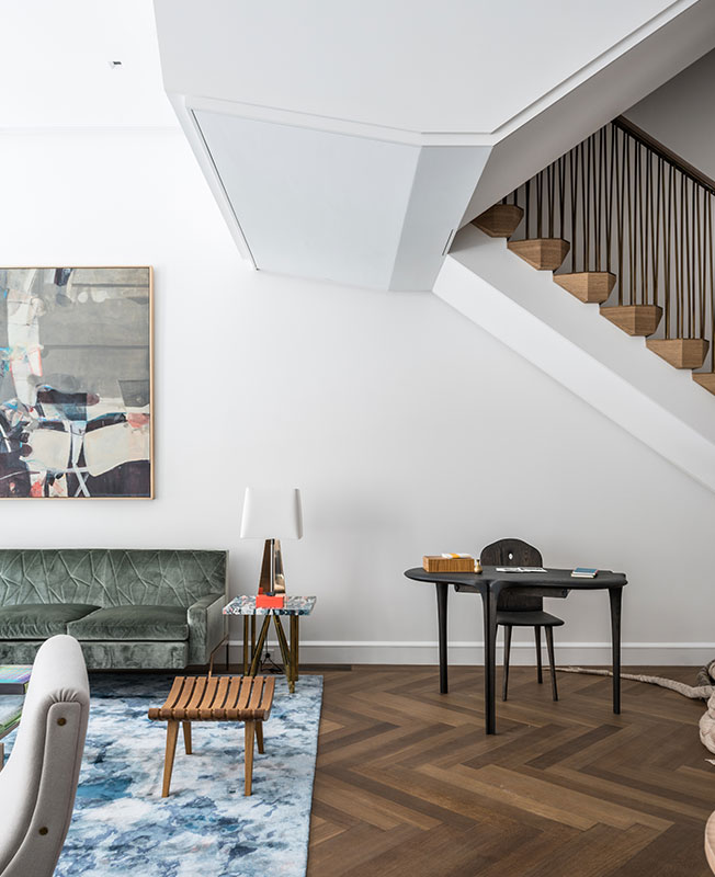 Первый этаж. Гостиная. Диван выполнен на заказ мастерской KGBL в шелковом бархате Larsen. Рядом столик из джемсонита Хильды Хеллстром. Письменный стол и стул из тонированного ясеня выполнил на заказ Кристофер Куртц. Живописная работа: Роберт Сот.