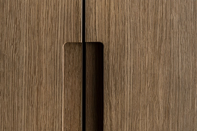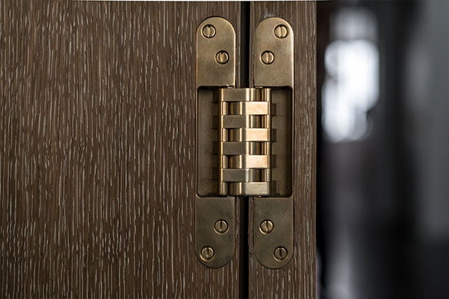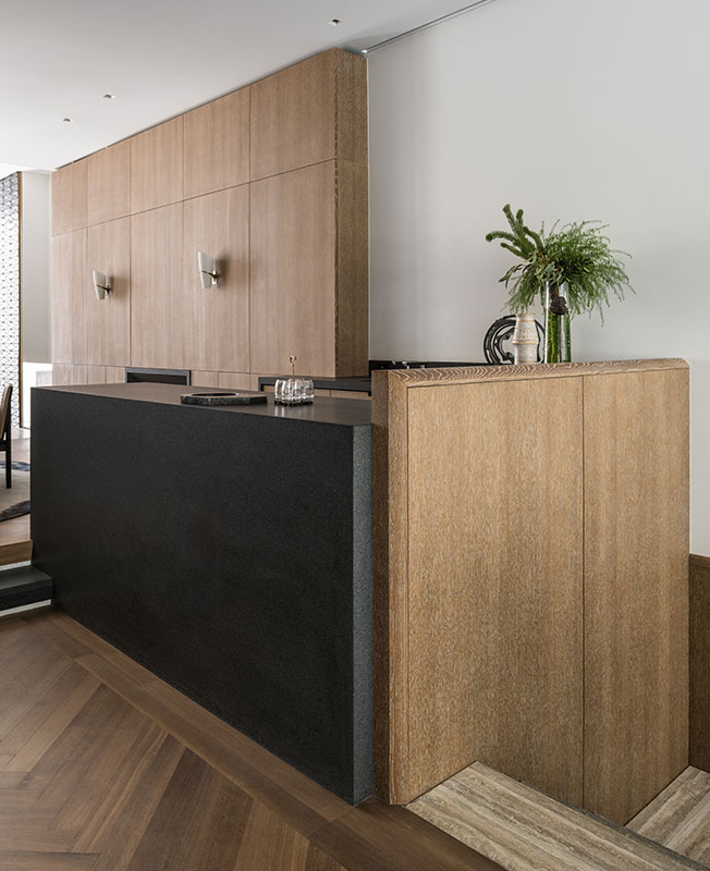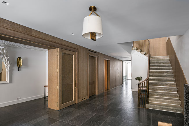 Лестница демонстрирует великолепную работу с материалом. Перила из дымчатого дуба сочетаются с бронзовыми балясинами, ступени выполнены из травертина.