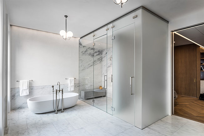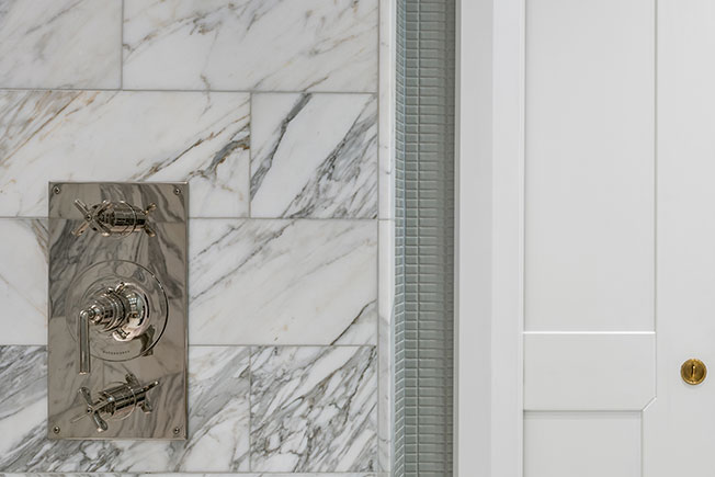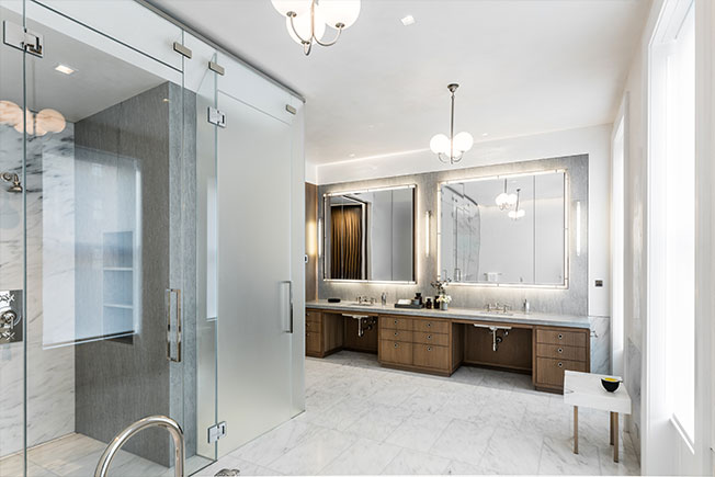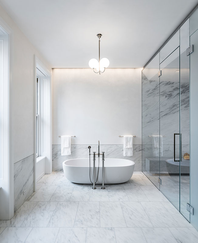Главная ванная комната. Ванна Boffi, арматура Waterworks, раковины и умывальные столы изготвлены на заказ.