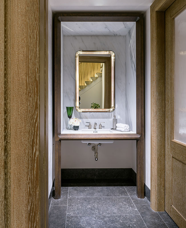 Лестница демонстрирует отличную работу с материалом. Перила выполнены из дымчатого дубоа, балясины — из бронзы и стали. Керамическая плитка выполнена по эскизам MKCA мастерской Boston Valley Terra Cotta.