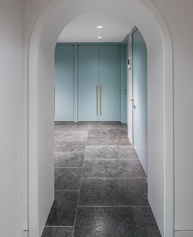 Входной холл. Небесно-голубой цвет гардеробов контрастирует с серым камнем на полу.