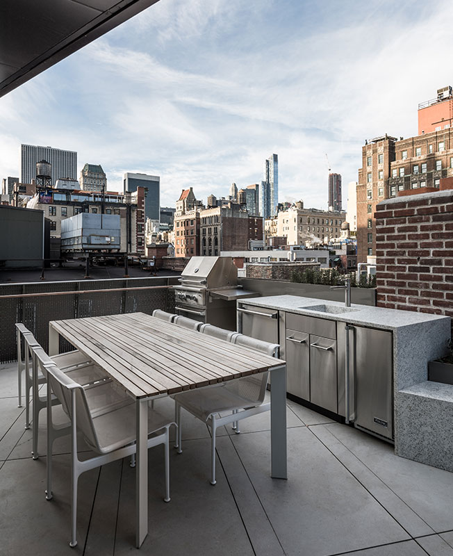 На крыше оборудована открытая столовая. Стол Paola Lenti. Cтулья, диз. Ричард Шульц, Knoll.