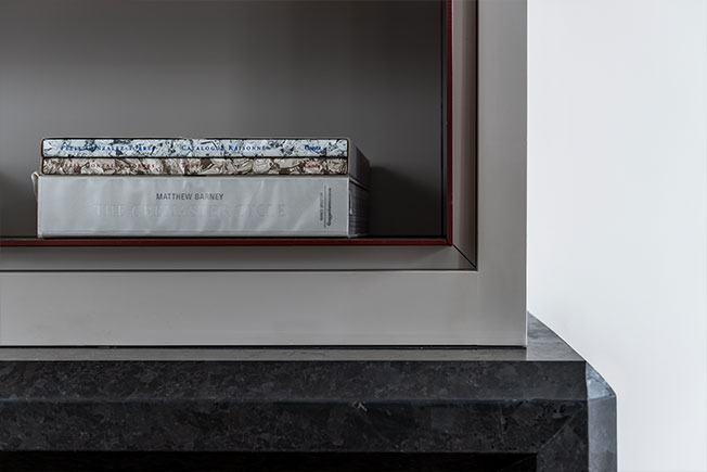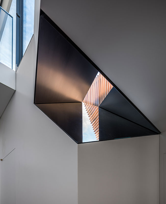 Инсталляцию Саре заказали еще на этапе создания концепции: геометрическая конструкция встроена над лестничным пролетом и выполнена из алюминия, антибликового стекла и серебристого зеркала. В ее полированных поверхностях отражается лестница, ведущая на террасу, дополняя архитектурную асимметрию. Сара уделила особое внимание форме объекта, которая могла бы оптически усложнить пространство, повлиять на восприятие интерьера в целом.