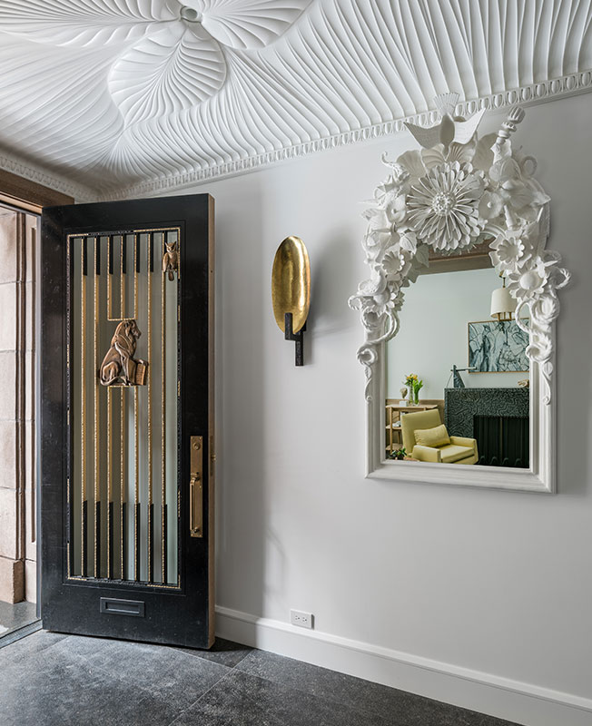 Вестибюль. Дверная решетка изготовлена на заказ ремесленниками Tuell and Reynolds. Зеркало Trouve — работа Codor Design. Бра авторства Эрве ван дер Стратена. Декор потолка изготовлен MKCA с помощью цифровых технологий.