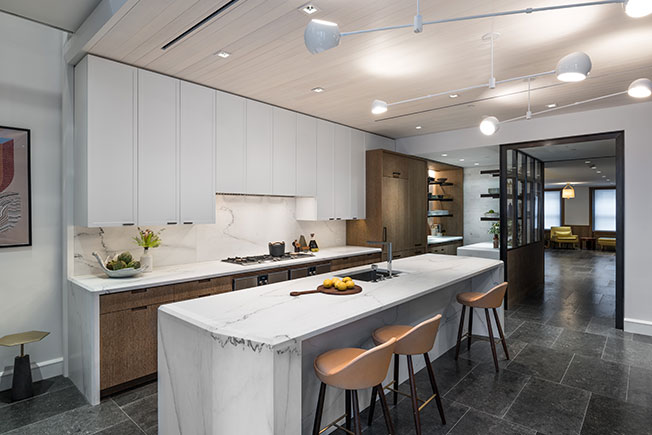 В зоне библиотеки оборудована компактная кухня. Диван изготовлен на заказ Egg Collective, ковер из фетра и мохера — работа Даны Барнес. Столик из бронзы и мрамора выполнил дизайнер-скульптор Эрик Шмитт. Барные табуреты KGBL.