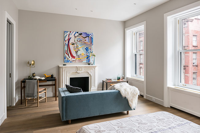Одна из гостевых спален. Кровать DWR. Письменный стол Jens Rison, стул Fort Standard, настольная лампа Workstead. Диван Ward Bennett в мохере Holland and Sherry. Над камином живописная работа Илоны Савди, 315 Gallery.