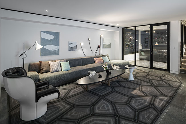 Подземный уровень. Лаундж при винной комнате. Модульный диван изготовлен по дизайну MKCA в текстиле Clarence House. Слева винтажное кресло Elda, дизайн Джо Коломбо. Столик в фактурном дубе заказали Fort Standard, ковер — компании Tai Ping. Светильник под названием F*** Droog Lamp: Castor. Винтажный торшер Arteluce.