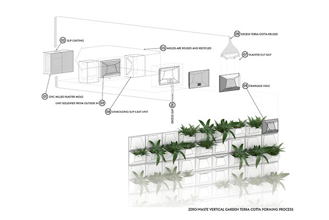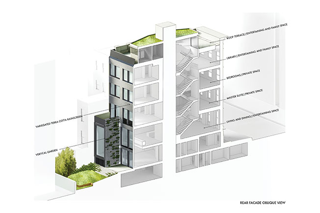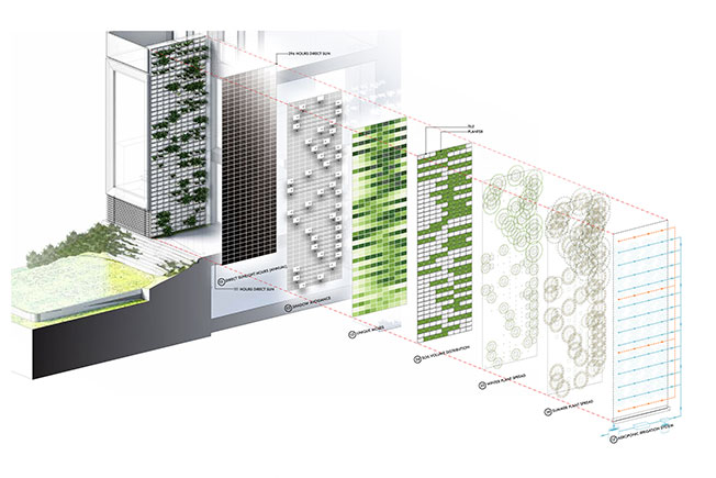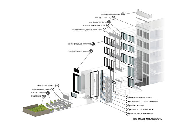 Майкл Чен облицевал фасад керамическими блоками и выстроил вертикальный сад с умной системой орошения: сад nano-biome можно наблюдать как с наружной стороны дома, так и изнутри, через огромные вытянутые окна. В нем высадили 12 видов растений, некоторые из которых (такие, как камчатский очиток) находятся под угрозой исчезновения в Нью-Йорке. Привлеченные к проекту ученые и ботаники Suny считают, что подобные вертикальные сады могут быть неплохим способом сохранения редкой флоры: тут учли и оптимальную температуру, и количество влаги, и распределение света. Для экологического анализа и прогноза специально разработаны цифровые методы проектирования.