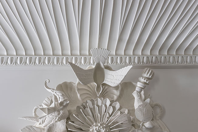 Фрагмент вестибюля. Зеркало Trouve (на фото видна верхняя часть рамы) — работа Сodor Design. Декор потолка изготовлен MKCA с помощью цифровых технологий.